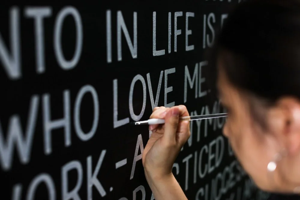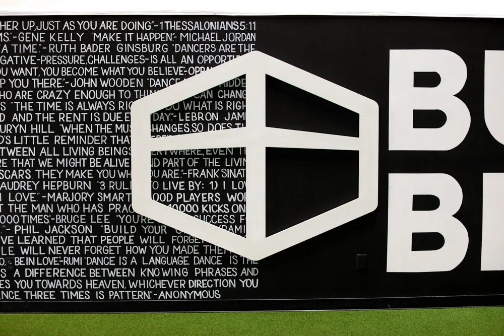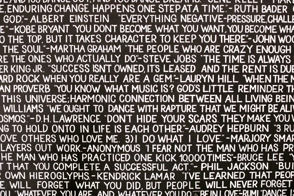 I painted this 8’ tall x 40’ wide mural for Building Block, a dance space built inside an athletic training facility in San Diego. The left side of the wall is comprised of various quotes that are meant to motivate and inspire anyone who walks into the space.