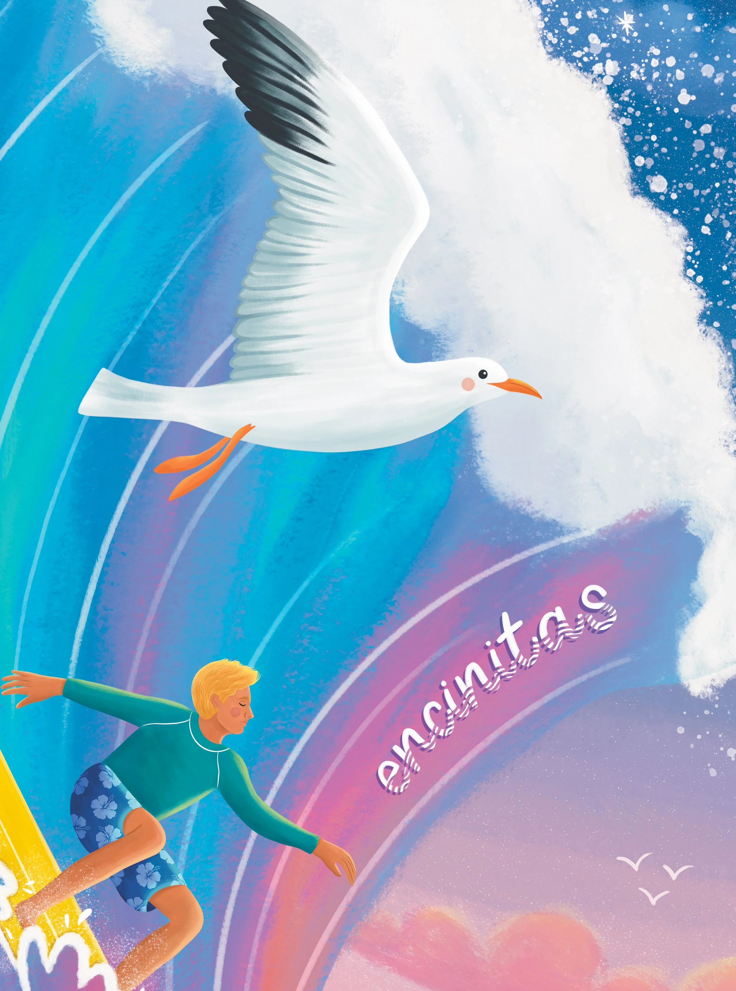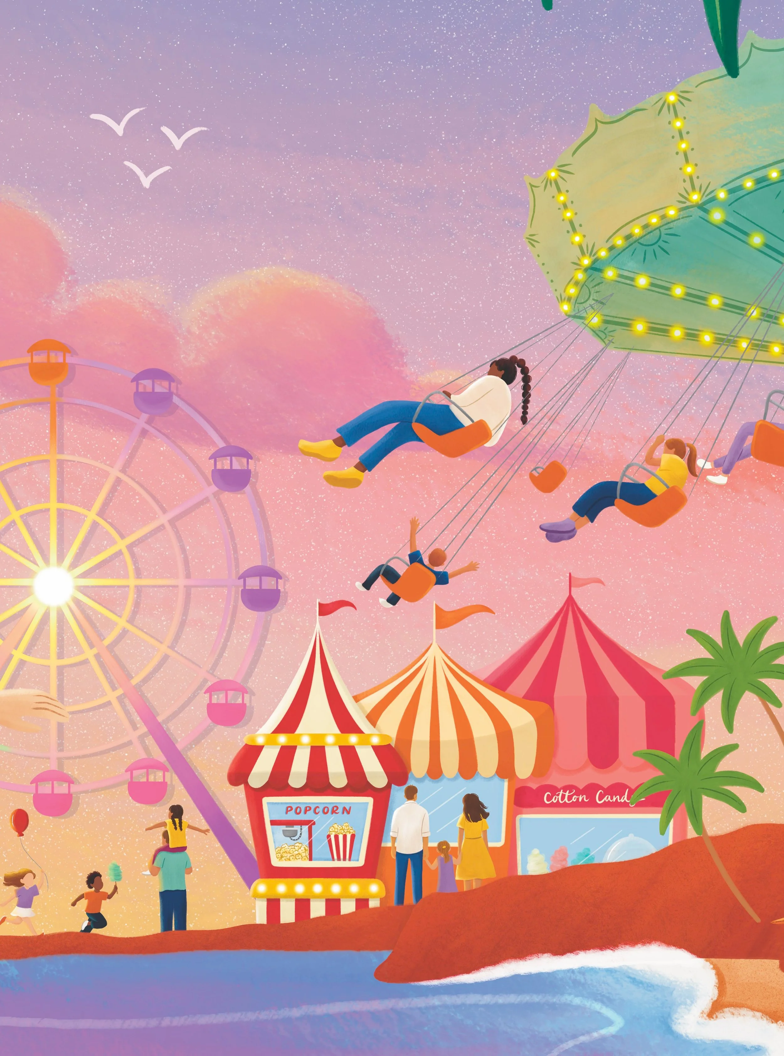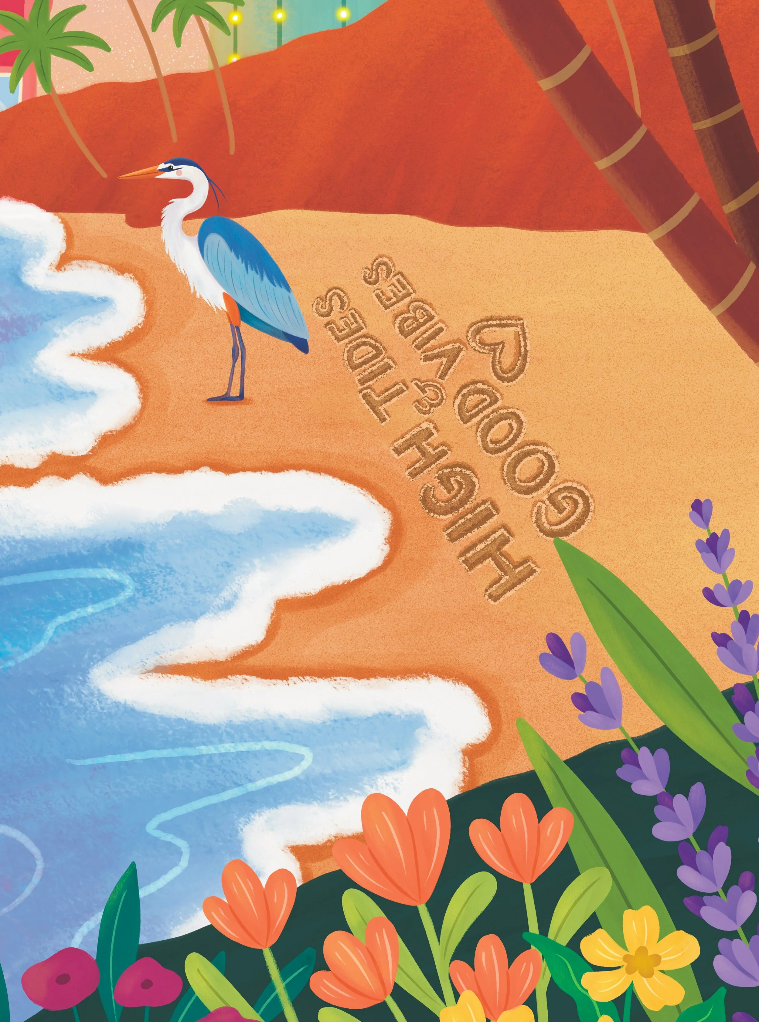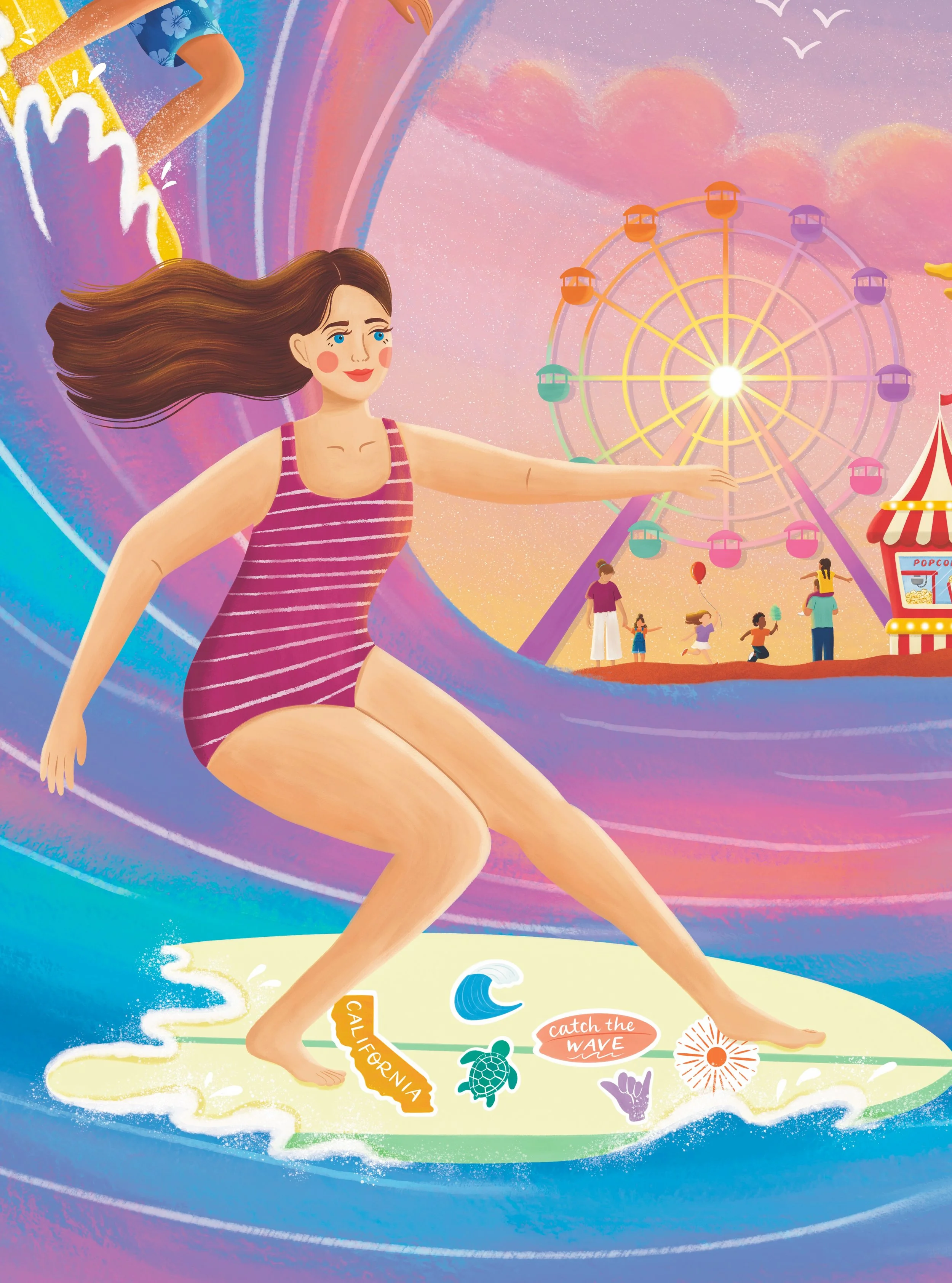 For this piece, I wanted to capture the awe I felt when I first moved to San Diego and visited the Moonlight State Beach. The palm trees, seagull, great blue heron, and wildflowers are a nod to the rich biodiversity that can be found in Encinitas. I also wanted to capture the joy and magic of the San Diego County Fair.