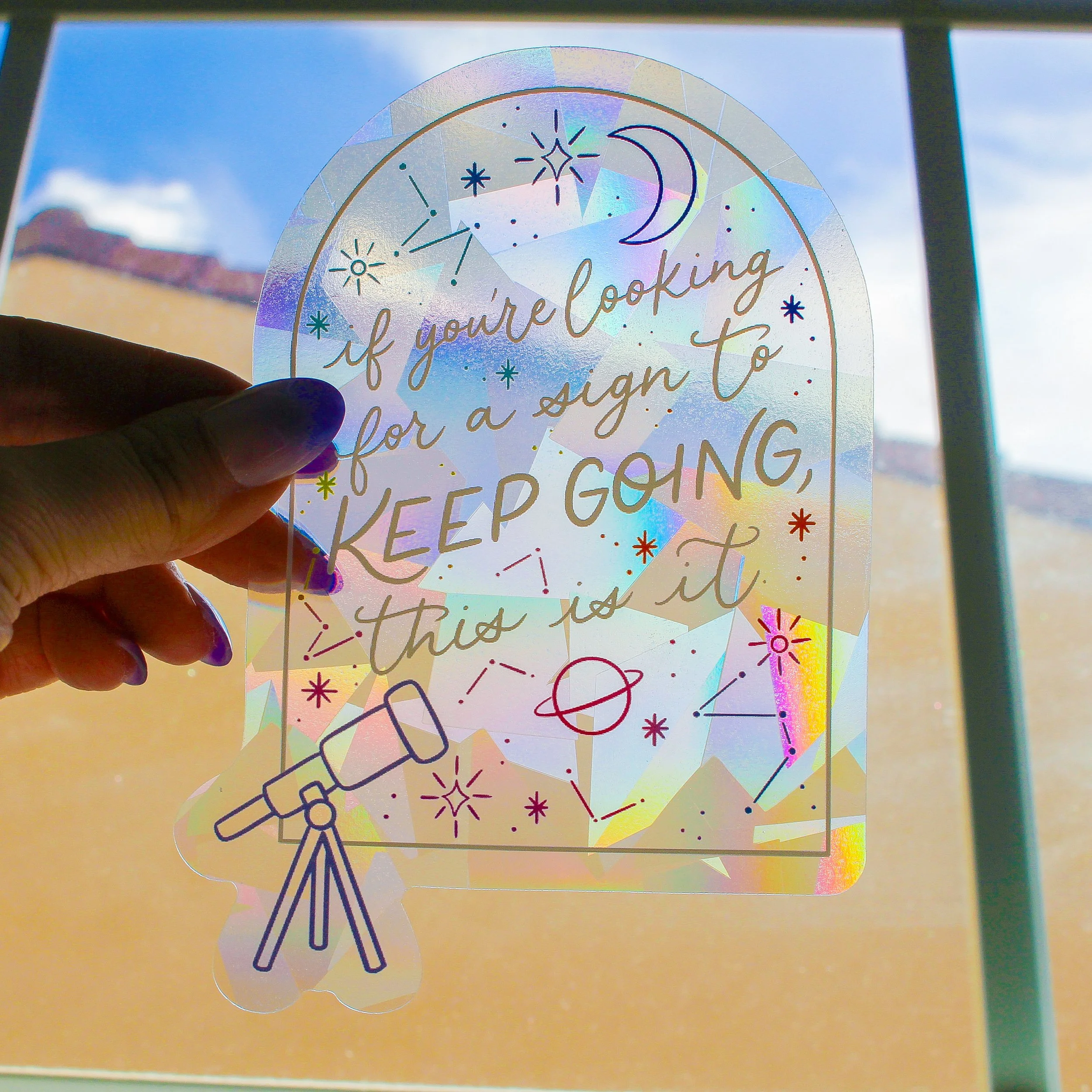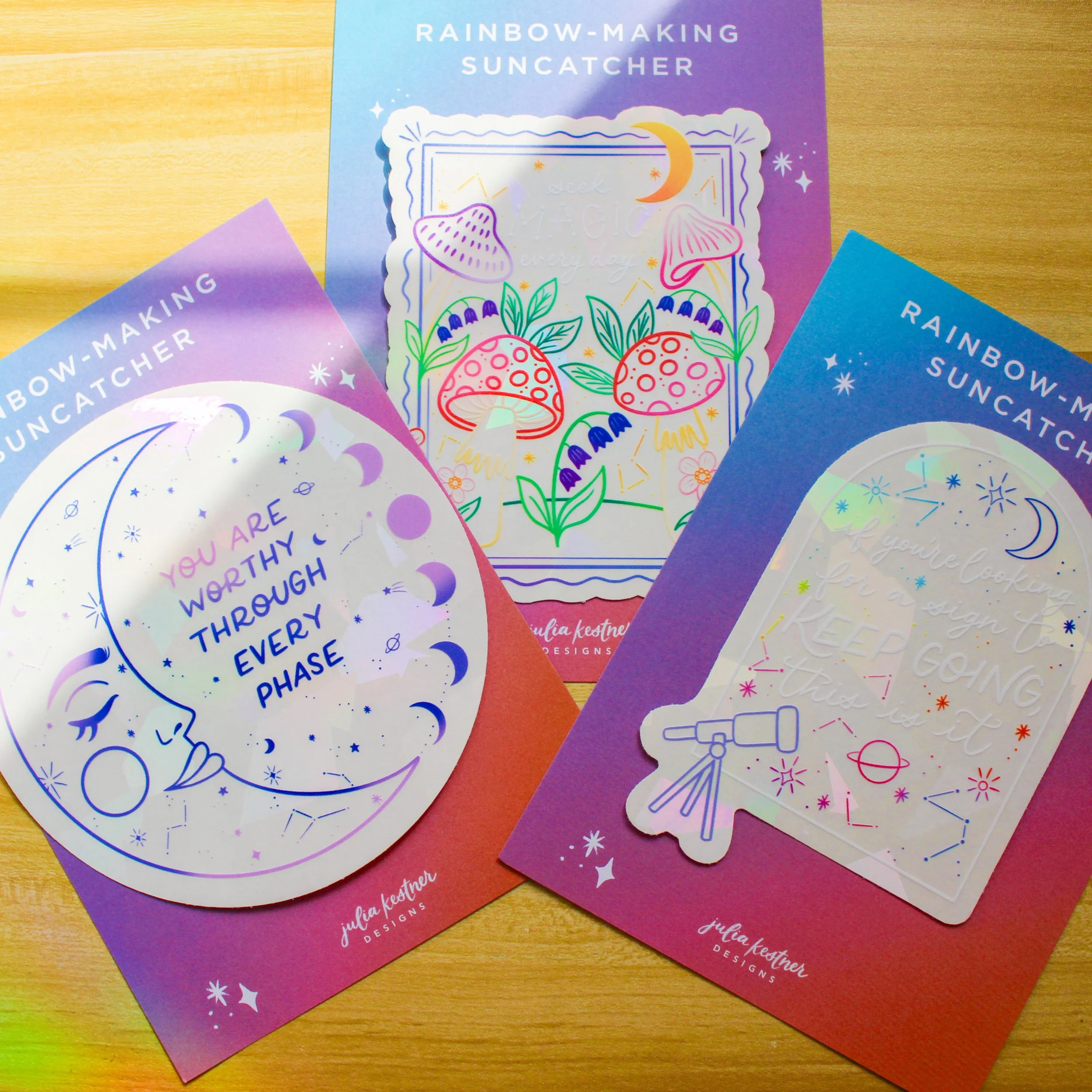 Introducing the celestial-inspired suncatcher trio, a radiant collection designed to uplift your spirits and infuse your space with encouragement and magic. Each decal features a celestial-inspired design paired with an uplifting phrase.